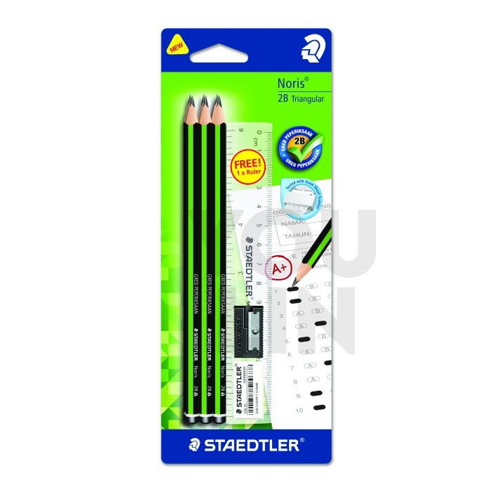 Blistercard containing 6 graphite pencils 2B, 1 sharpener, 1 eraser and 1 ruler